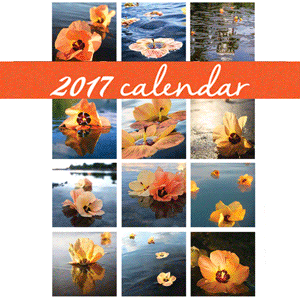 My tropical 2017 hibiscus art calendar is filled with a year’s worth of gorgeous photographs of hibiscus flowers floating on the waters of the lagoon or on the black sands of Tahiti.