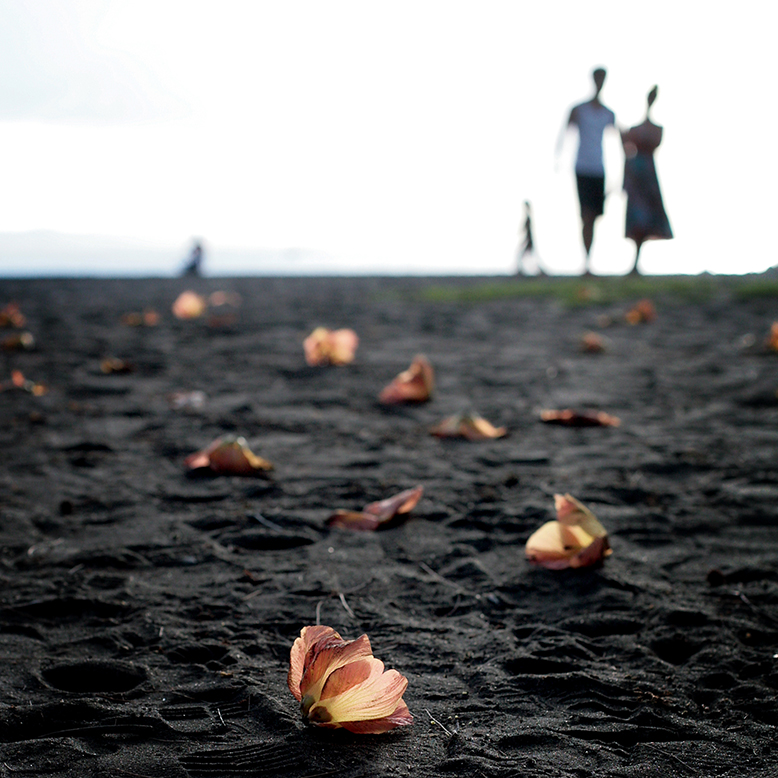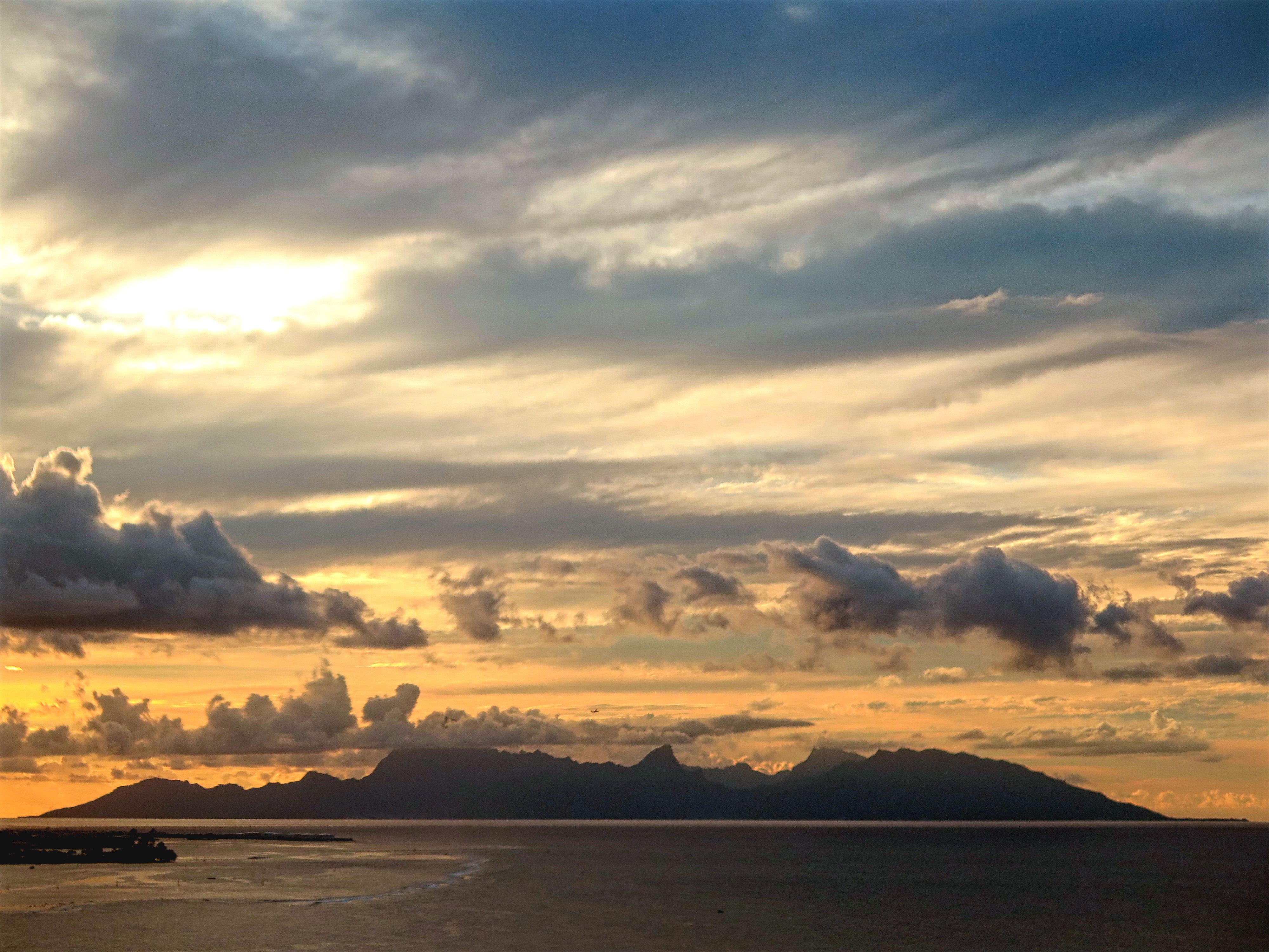 - Back to the black-sand beach for a magical sunset swim. You have the incredible views of Papeete and Moorea, the neighboring island. The view of the bay is spectacular. Around sunset time, local Polynesians might gather around beach-fires on the beach playing Tahitian rhythms.