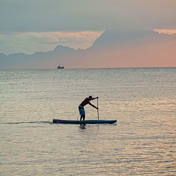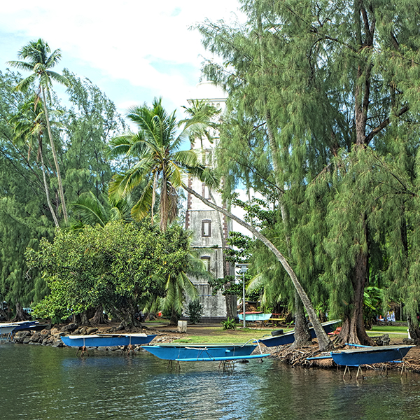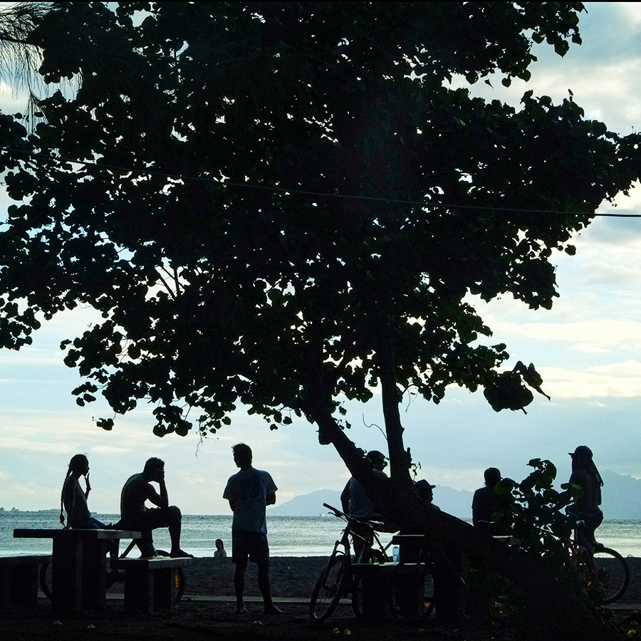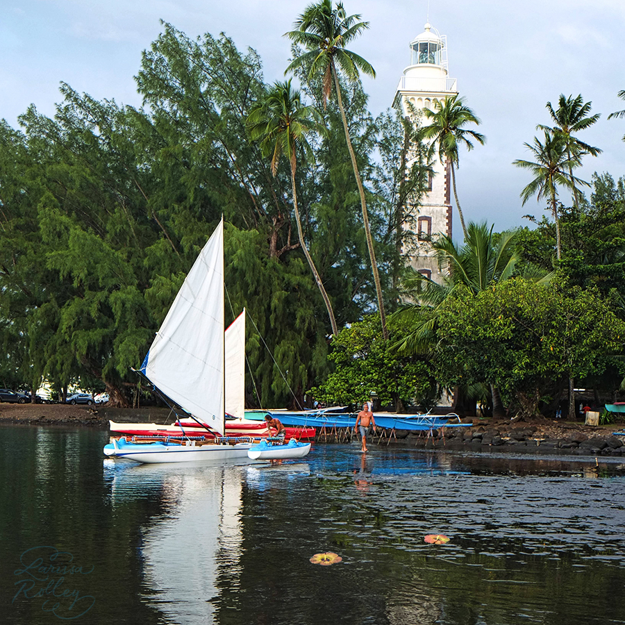 - The estuary is calm and shallow – the body of water on the other side of the tip of the peninsula. One side has the black-sand beach, and the other side is the estuary. Really nice for watching local races depending on the time of year, and teams training in the traditional pirogues (the traditional outrigger canoes with the counterweight, or va’a in local Tahitian language). You can stroll along under the shade of palm trees. There may pirogue fishing boats up off the water, awaiting sunrise to go out in the morning again.